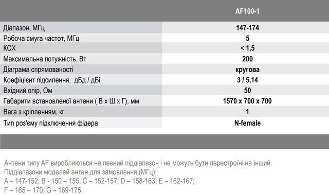 Антена колінеарна AF-100-1, 3 дБд5,14 dBi, 144-174, смуга 5 МГц